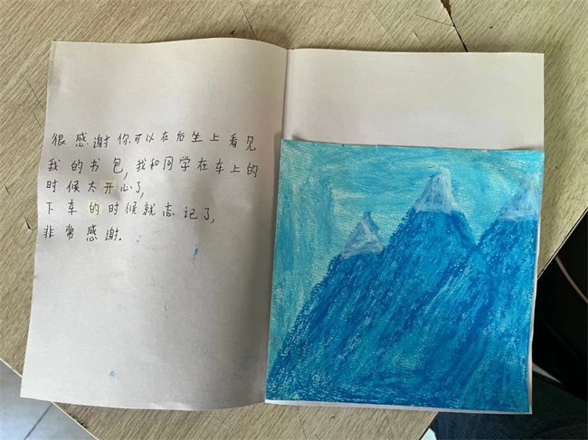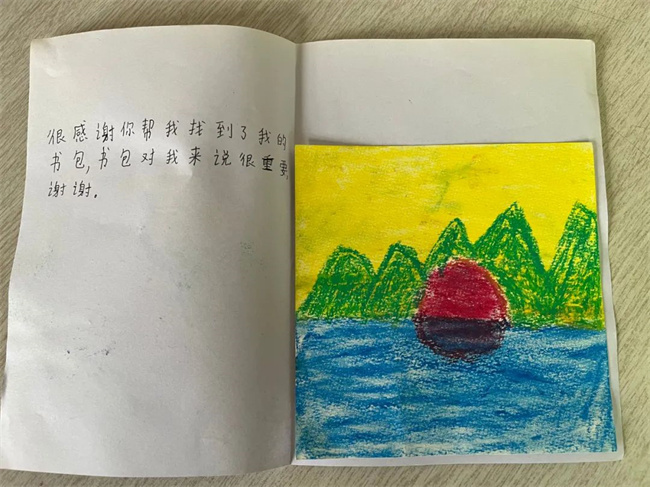 打開這封信,是一封由小朋友自己親手制作的感謝信,信中寫道:“很感謝你在后座上看見我的書包,我和我的同學(xué)在車上的時候太開心了,下車時就忘記了,非常感謝?!薄昂芨兄x你幫我找到了我的書包,書包對我來說很重要,謝謝?!?/p>