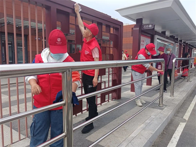 活動(dòng)中,志愿者們身穿紅馬甲、頭戴小紅帽,手中拿著抹布、清潔刷、水桶等清潔工具,對(duì)樞紐站內(nèi)的候車?yán)?、站臺(tái)等進(jìn)行集中大清掃。