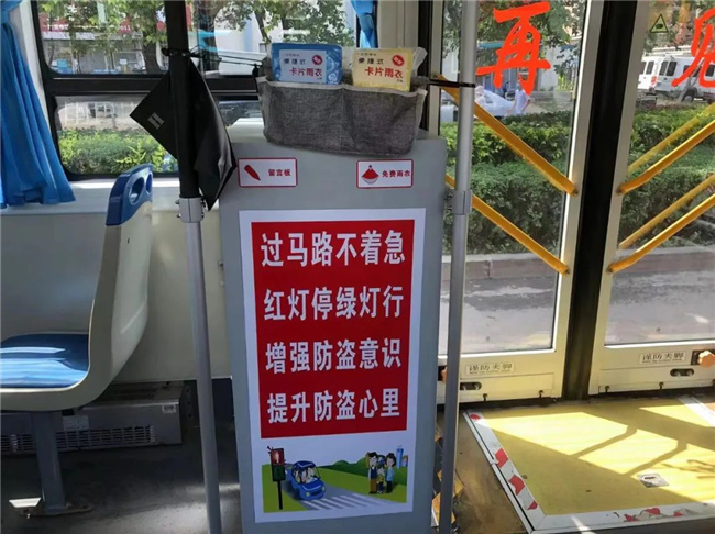 今年7月,胡影自己“裝扮”起了車廂,在業(yè)余時間購置了便民醫(yī)藥箱、一次性雨衣、手套、口罩、留言簿以及溫馨提示語。胡影說:“夏天的雨經常猝不及防,很多人出門沒帶傘,車上備些防雨用具,可以方便乘客。”